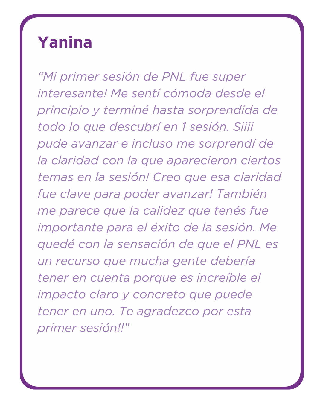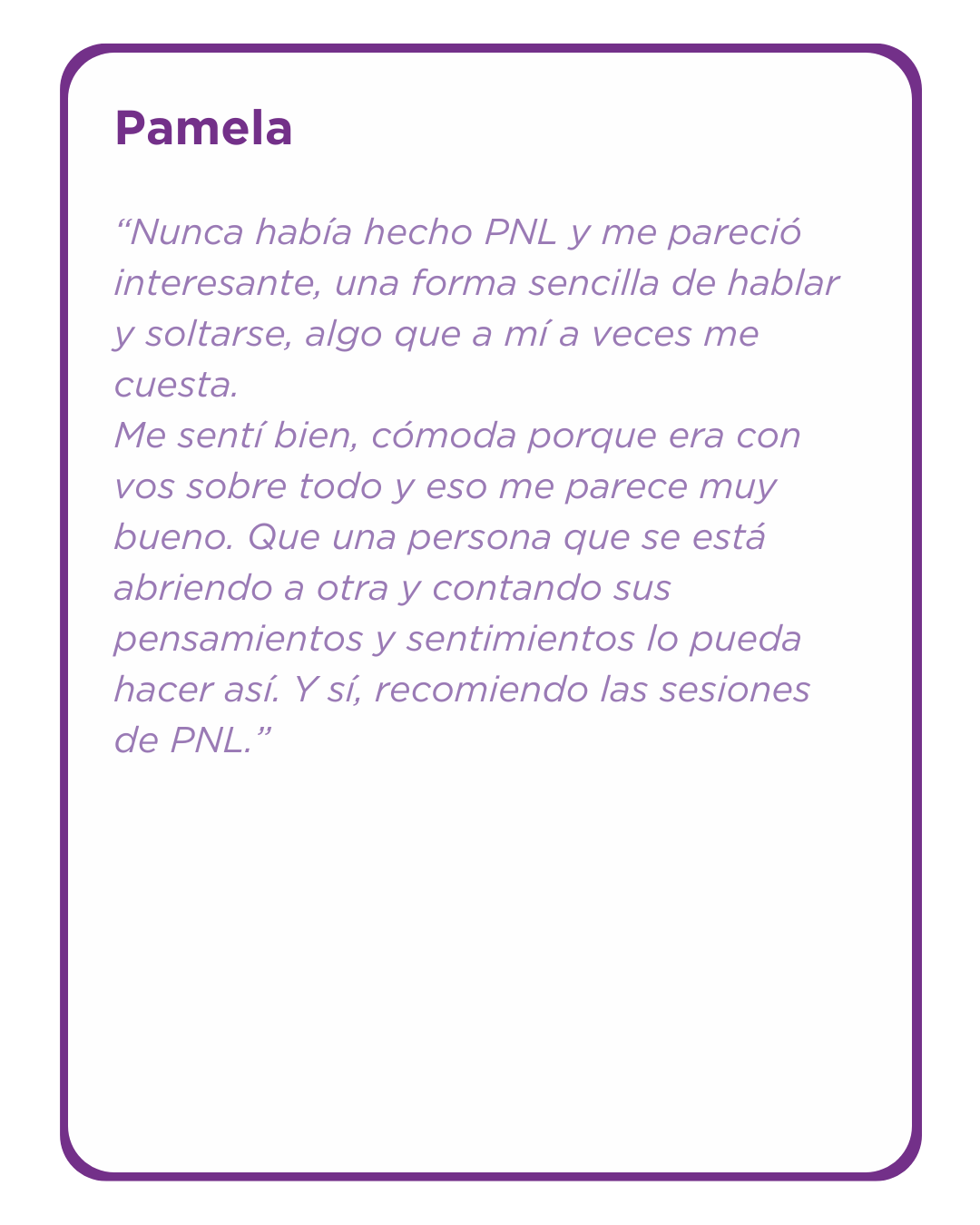 La vida me llevó a vivir cosas para las que no estaba preparada, y me topé con la PNL con la esperanza de resolver y rearmar las partes de mí misma. Luego de varias sesiones, donde traté distintos temas, pude realizar los cambios que quería y que sentía no poder hacer.